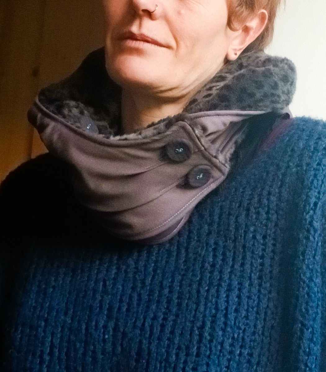 Réversible, ce col-capuche se porte côté fourrure à l'extérieur pour un look princesse polaire !